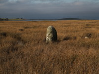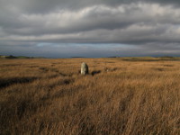 The megalithic complex of Killadangan is situated on the southern shore of Clew Bay, about 5km west of Westport and 2km east of Murrisk (road R335) and is part of Clew Bay Archaeological Trail. The monuments, probably date from the Bronze Age and consist a Stone Row, a Stone Pair, four Standing Stones and possible remains of a fulacht fiadh (bronze-age cooking area) and Stone Circle, suggesting that it was a major worship place. The most remarkable part of this megalithic complex is Stone Row, which include five standing stones (four still standing and one fallen) which increase the height from north (0.5m) to south (1.2m). During the winter solstice, on 21st of December about 1:50pm, the sun is directly in line with the stones and dips into small niche of east shoulder of Croagh Patrick before disappearing shortly behind the mountain.