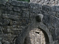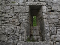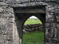 Temple Cronan is a small church, sited inside a small walled enclosure located 1.5km north-east from village of Carran, in east part of Burren, County Clare. It was built in the 12th century and in those days, it was monastic settlement containing the church, two shrines, termon (peace of land around a church giving right of sanctuary), at least one termon cross, a holy well and few domestic buildings and it was an important place of pilgrimage. The tradition tells that the first monastery on this site was founded in the 7th century by St Cronan (possibly the same saint who foundfed monastery in Roscrea). The church itself is a small oratory made of massive stone blocks with lintelled doorway in the west wall. Current entrance to church, a Gothic doorway with a pointed arch was inserted into the north wall in the 15th century. The carved human and animalistic heads (six or seven in total) dotted around the the church walls are also later additions. On the east side of the church there is stone tomb-shrine, made of flat limestone slabs pitched tent-like against each other. It known as the Bed (or Grave) of St Cronan.
