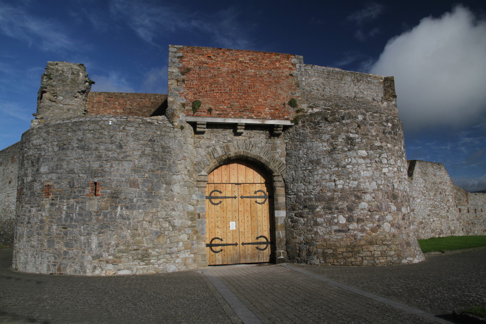 Castle in Dungarvan (County Waterford), also known as King John's Castle is an Anglo - Norman fortress built in 1185. The castle is situated at the eastern corner of the town on the bend of river Colligan, just before escape to the sea. Defensive walls create the shape of shell, what is unique in Ireland, but quite common in England. There are two towers on the sides of front gate and one in the corner. From beginning the Castle was garrisoned by the English forces and was held by them almost incessantly for over 700 years. At the end of the 17th century the castle was destroyed, to prevent it from being used by rebels, but within a few years decided to install there a garrison again. In the first half of the 18th century two-storey military barracks were built which remained in British hands until 1920. During Irish Civil War barracks were taken by the IRA who upon leaving in August 1922, set fire to the structure. After the foundation of the Garda Síochána in the Free State, the barracks was restored and became the local Garda Station until 1987, and now there is informative exhibition on the history of the castle.