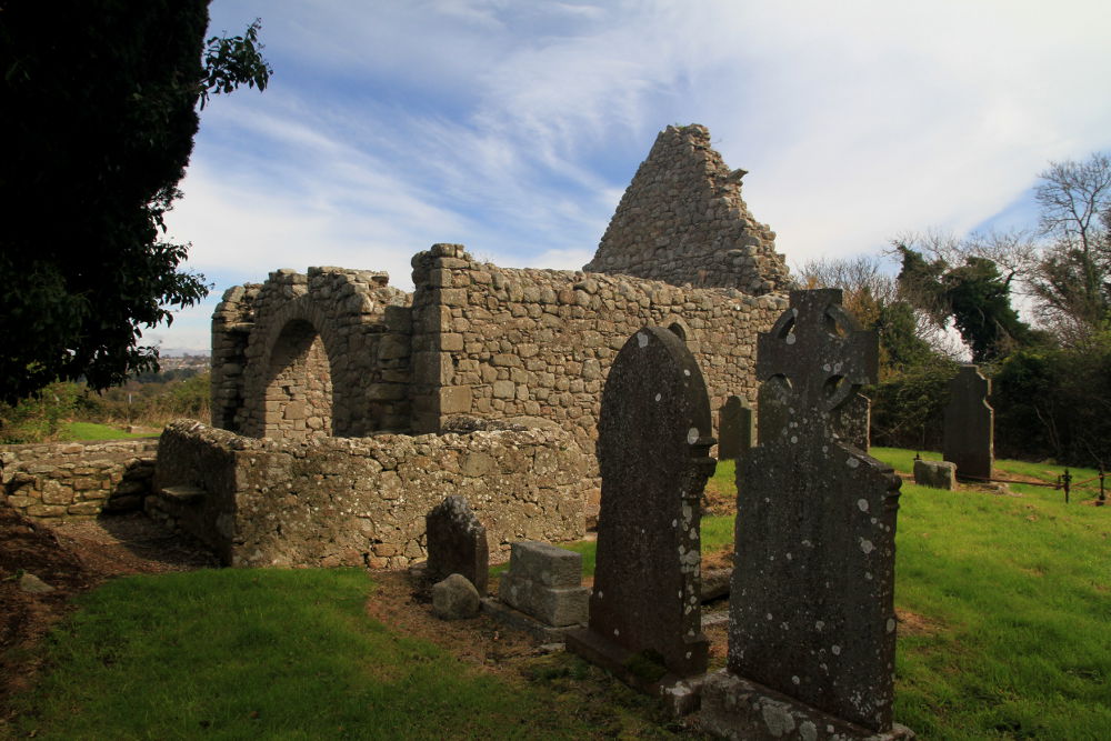 Remains of Tully Church are located in Laughanstown near Cabinteely, on southern suburbs of Dublin. The site consists of ruined medieval church and two stone high crosses and is reputed to be dedicated to St. Bridget. The exact date of construction of first church in this place is unknown but the remains of foundation of the early nave may be from 9th century or older. The chancel, divided from the nave by fine arch was added in late 12th or early 13th century, and is unusual that it is wider than the nave. Tully Church with its lands was donated to Christ Church in Dublin by Sitric Mac Torcaill, shortly after Anglo-Norman invasion and continued to be used until beginning of the 17th century. Approaching the church, on the left hand side of the road you will find the granite ringed cross (2.3 m high) seated on a massive stone pedestal, probably dating from the 10th century. The top of the cross is shaped into gabled roof. The second granite high cross (incomplete on one side), dating from 12th century is located in the nearby field, the north-west to the church. It's 2.2m high and it has a figure of bearded bishop carved on one side, and on the other side there are strong raised mouldings outlining the cross, with a faceless head at the intersection of the arms. From the site there are wonderful views of Killiney Hill and Irish Sea to the east, and Dublin Mountains to the west.