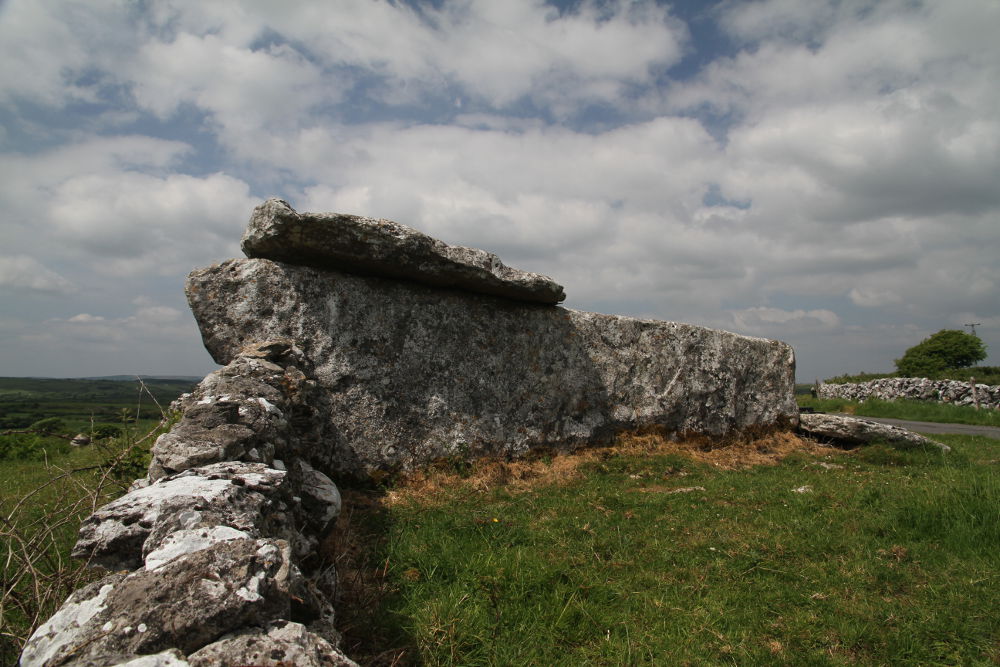 Ballyganner South Wedge Tomb, located about 4 km east from Kilfenora in County Clare has the largest chamber of all the wedge tombs of Burrren.The monument decreases regularly in height and width from west to east and its sides are each made of one huge slab. Its chamber is 4.20m long, 2.95m wide and 1.60m high at the west, and 2m wide and 1m high at the east. Its eastern end is completly closed by single stone slab, while the western end (which unfortunately, now is incorporated into a stone fence) has gap between the closing slab and side slab. The chamber was probably covered by one great slab, which could have dimentions 6.1m by 3.35m. Two of remaining pieces of roof stone are held up by a steel beam, and the rest are scattered around and inside. The exact date of its construction is unknown but generally the wedge tombs date c.2500 - 2000BC.
