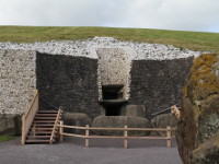 The passage tomb of Newgrange is one of the most important Neolithic Monuments in Europe and toghether with Knowth and Dowth, has been designated as UNESCO World Heritage Site, what makes it one of the most visited tourist attractions in Ireland. It is located about 4 km east of the village of Slane, in County Meath (the only access to the monument is through the Bru na Boinne Visitor Center, which is well signposted from the N2 road). This great cairn was built around 3200 BC by Neolithic people who settled this area 6000 years ago. It has approx 80 m in diameter, is about 12 m high and is surrounded by 97 large kerb stones richly decorated with intricate rock art. One of the most notable examples is entrance stone with famous triskele-like features carved on it. The mound of Newgrange covers single tomb. 19 m long passage leads to the large central chamber (5m by 6m, with perfectly made corbelled roof, which rises up to 6 m) with three small chambers (or recesses) on its sides, which together form a cross shape. Each satellite chamber contain large stone basin, which may have originally held human remains. Both, the passage and chambers are richly decorated with megalithic art. The Newgrange passage tomb is aligned to the south-east so that the rays of the midwinter solstice sunrise come through the "roof-box'' above the entrance and shine down the the passage and finaly illuminate the chamber. During excavations, archaeologists found the remains of at least five people, two unburnt and three cremated, most were concentrated in the east and the west chambers but also some occured in the central chamber and at the junction with passage. They also found seven stone polished stone balls, two stone beads, four pendants, various fragments of bone pins, a flint and bone chisels. The reconstructed front facade of white quartz stones studded at intervals with water-rolled boulders is interpretation of archaeologist Michael J. O'Kelly (who led the excavations and restoration of Newgrange in the years 1965 -72) and has raised some controversy in archeological community. The quartz stones and the granite cobbles that were found during the excavation, scattered around the cairn. It is interesting that none of these stones are local to the Boyne Valley. Quartz came from Wicklow and granite from Dundalk Bay. Around the Newgrange mound there is Great Stone Circle built in the mid to late third millennium. Three of the upright stones near to the temple entrance throw shadows onto the decorated stone on the midwinter solstice sunrise, the equinox sunrise, and the sunrise of the midpoint beetwen solstice end equinox. Newgrange passgae tomb can be visited only by guided tours from Brú na Bóinne Visitors Centre. The tour is very interesting and well organized.