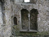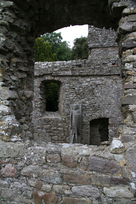 Kilfane Church is located about 5 km north east from Thomastown in County Kilkenny. The ruins which survived to this day, dates from the 14th or 15th century but also some features from older structure are still visible. A 13th century sedilia near the altar is believed to have come from an earlier church. Defensive tower adjoining the church had residential accommodation for parish priests in the upper storeys and sacristy on ground floor. The main attraction of this site is undoubtedly the 2.4 m tall limestone tomb slab, with sculpted effigy of a Norman knight in detailed chainmail armour and Cantwell coats of arms on his shield. His legs are crossed, believed to show that he was a participant in the crusades. Is believed that the statue represents Thomas de Cantwell, lord of the Kilfane who died in 1319. Sculpture is known as "Cantwell Fada" and probably dates from the 14th century. It was unearthed in the church grounds in relatively recent times, around 100 years ago.