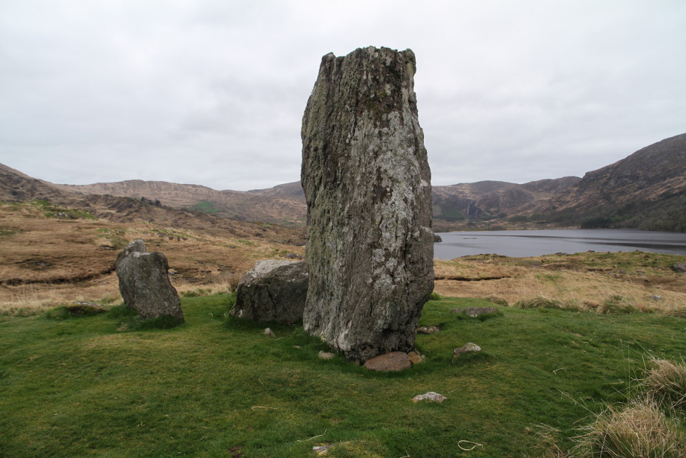 Uragh Stone Circle is located near Gleninchaquin Park, on Beara Peninsula, County Kerry (around 15km southwest from Kenmare, signposted on the road R571). It has stunning location on the low hill between lakes Cloonee Upper and Lough Inchiquinn, with the waterfall on the background. The stone circle is 2.4 m (8 feet) in diameter and consists of five upright stones and one massive, over 3m high stone outside, which is set radially to the circle aligned along the NE-SW axis.