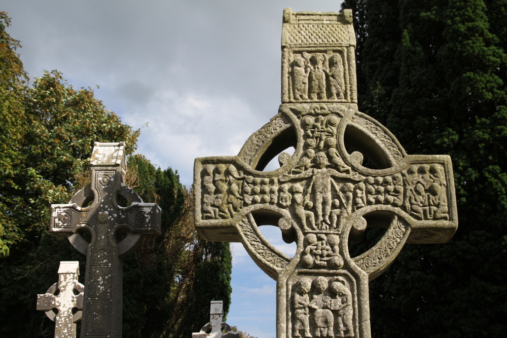Monasterboice is a ruin of early Christian settlement located 10km northwest of Drogheda (just of M1 motorway). The remains of two churches dates from late medieval period but first monastery was founded here in 6th century by Saint Buithe. There is also 28m high, roofless round towrer, which was burnt in 1097. The monastery functioned until 1122, there are also records that it was occupied by the Vikings in the middle of the 10th century. The main attraction of Monasterboice are with no doubt its High Crosses, two of the finest and best peserved sandstone examples in Ireland. The South Cross is about 5.50 m high and dates back probably from early tenth century. It is also called Muiredach's Cross after the inscription in Gaeilge carved on its base: "ÓR DO MUIREDACH LAS NDERNAD IN CHROS", what means "A prayer for Muiredach by whom the cross was made". Probably he was abbot at the end of 9th century and died in 923. The cross carvings features biblical scenes as Adam and Eve, the Crucifixion, the Adoration of the Magi, the Archangel Michael weighing souls and Pilate washing his hands. Muiredach's Cross is considered one of the most important early medieval sculpture in the world. The West Cross is 6.50m high, what makes it tallest high cross in Ireland. It also has largest number of biblical motifs carved on it. The third cross, called North Cross, is much plainer than the other two crosses. The face of the cross depicts the Crucifixion scene. Amongs the other remains at Monasterboice are two early grave slabs and sundial stone.