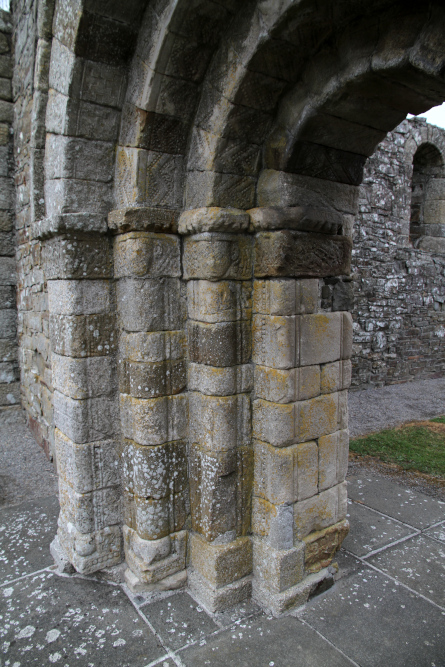 Killeshin Church (Co. Laois) is located about 5 km north-west of Carlow Town, on the site of an Early Christian monastery founded by St Comdhan in the 5th century. The church was built in the 12th century and has one of the finest Romanesque doorway in Ireland. The doorway has four orders and is made of three kinds of stone: fine-grained brownish-purple sandstone, coarse-grained yellowish granite and a lighter coloured finer-grained granite. The arch's ornaments feature the carvings of chevrons, zigzags, animal and foliage. The capitals have human heads carved at the angles, the first and fourth with beards and moustaches, and second and third shaved. There are also two inscriptions on the doorway Killeshin Church. First refers to Cellachan, who could have been a master stonemason of the church. The second inscription may read ''Prayer for Diarmait King of Leinster" and probably refers to Diarmait MacMurchada, who is credited with inviting the Normans to Ireland. To the north-west of the church, there was a 32 m high round tower which was demolished by the landowner in 1703, who was afraid that it might downfall on his castle.