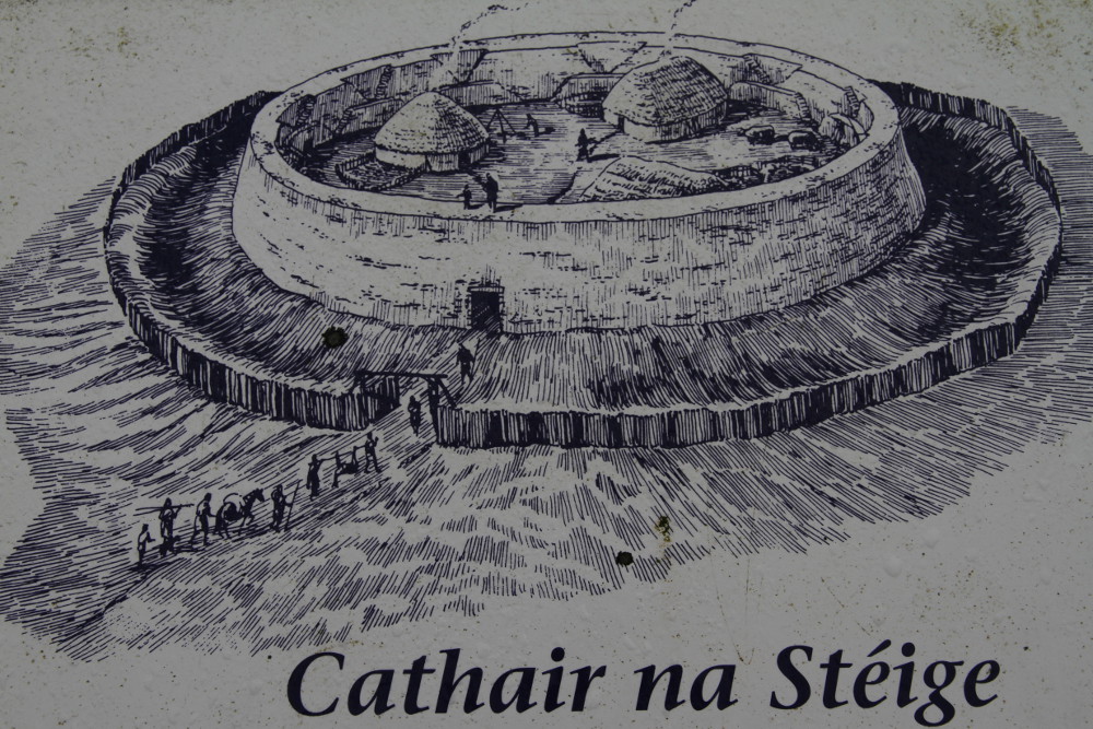 Staigue Fort (An Stéig) is partly ruined (but one of the largest and finest in Ireland) dry-stone, walled ringfort, located on the Iveragh peninsula in County Kerry (Ring of Kerry). Probably built in the early centuries AD as defensive stronghold for local chieftain. Fort is surrounded by earthen bank and ditch, has about 27 m (90 ft) in diameter, its walls are up to 6 m (20 ft) high and up to 4 m (13 ft) thick at the base, with the lintelled entrance and two small chambers inside the wall. Inner wall contains system of stairs leading to the top. None inner buildings survived to this day, but probably, there were even a few buildings (chieftain's house and some huts for guards and servants).